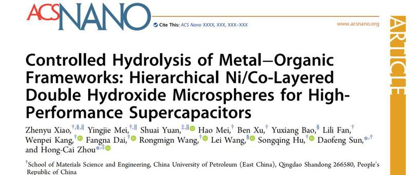 近日,我校材料科学与工程学院与美国德州农工大学合作,在MOFs可控碱解制备超级电容器电极材料方面取得突破性进展。相关论文《金属-有机框架物的可控水解:Ni/Co层状双金属氢氧化物多级微球用于高性能超级电容器》(Controlled Hydrolysis of Metal–Organic Frameworks: Hierarchical Ni/Co-Layered Double Hydroxide Microspheres for High Performance Supercapacitors)于2019年6月被材料领域权威国际期刊ACS Nano刊发。我校博生肖振宇、硕士生梅英杰为共同第一作者,孙道峰教授与周宏才教授为共同通讯作者,william威廉中文官网(华东)为第一署名单位。